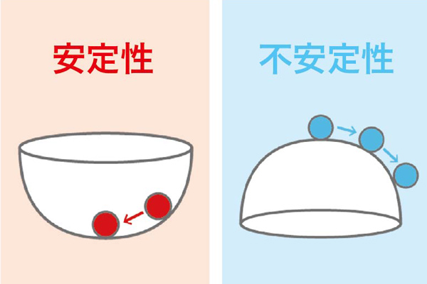 自動車を普通に走らせている時に、ハンドルを左右どちらかへ動かし(外乱)、手を放すとハンドルはすぐ元に戻り車は直進状態に戻ります。船でも飛行機でも同じように安定して航行することができます(安定性)。一方、ちょっとした外乱が加わると元に戻らずどんどんあらぬ方向に行ってしまうような状態を不安定性と言います。ヘリコプターやセグウェイのようなものは、人やコンピュータが外部から継続的に操作・制御することで安定性を実現します。半球状のボウルにビー玉を投入するとビー玉はボウルの中を行ったり来たりしながらボウルの底に定着し安定します。反対にボウルを裏返してその上にビー玉を乗せるとビー玉は外周へ落ちて行ってしまいます。前者が安定性、後者が不安定性です。原発は不安定性の最たるものです。重厚長大な設備やコンピュータ、さらには人による安定性を保とうとする努力によって、原子炉は安定性を保っています。外乱により制御が効かなくなった場合には、自然に安定状態に落ち着く新型原子力発電所の出現を期待したいですね。